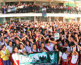 As announcements of accomplishments came to a close, a monumental one was unveiled. And it rode directly upon the wake of the Freewinds in tandem with IAS support, because working with volunteers, law enforcement and Scientologists, literally millions of copies of The Way to Happiness, The Truth About Drugs and The Story of Human Rights were distributed in major cities and jungle villages throughout Colombia.